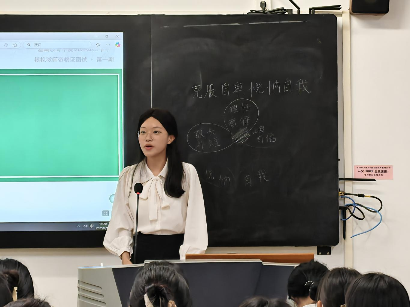 余冰雁抽到《克服自卑,悦纳自我》这一题,她将板书设计成一朵花的形式,简洁且直观,借以告诉员工:我们每个人都如花一般美丽,不必自卑,悦纳自我。在试讲中,余同学教姿教态自然大方,通过讲授法、问答法、小组探究法等多种教学方法,讲解要点,层次清晰。