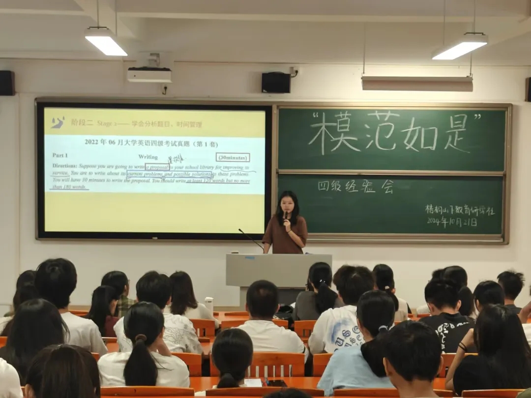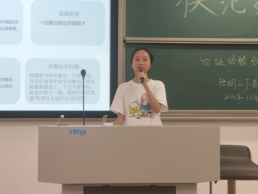 分享会现场气氛热烈,同学们积极互动、主动提问。“学姐学长们的分享,让我对全国大学英语四级考试的具体结构和流程有了更细致的了解,也学到了很多实用的方法和技巧,在备考的过程中我将更加有的放矢,也能更加合理规划不同板块的备考重点,期待自己在大学阶段有新的收获。”2024级小学教育专业本科生某同学说。