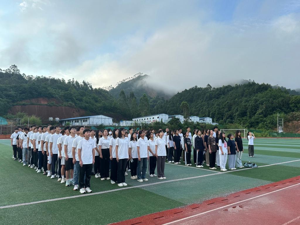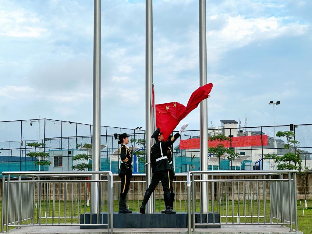 “向国旗——敬礼!”一声嘹亮口令后,擎旗手振臂扬起国旗。在雄壮的《义勇军进行曲》中,五星红旗冉冉升起。大家庄严肃立,齐声高唱国歌,注视着国旗缓缓升至顶端,迎风飘扬。