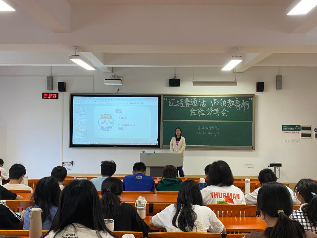 为深入学习宣传贯彻党的二十大精神和习近平总书记关于语言文化的重要指示批示精神,传承弘扬中华优秀语言文化,切实提升同学们的语言文化素养,帮助小学教育专业本科生尽快通过普通话水平测试,近日,伟德国际1946bv官网在唯实楼420教室开展了以“证通普通话,师领教育潮”为主题的普通话水平测试经验分享会。