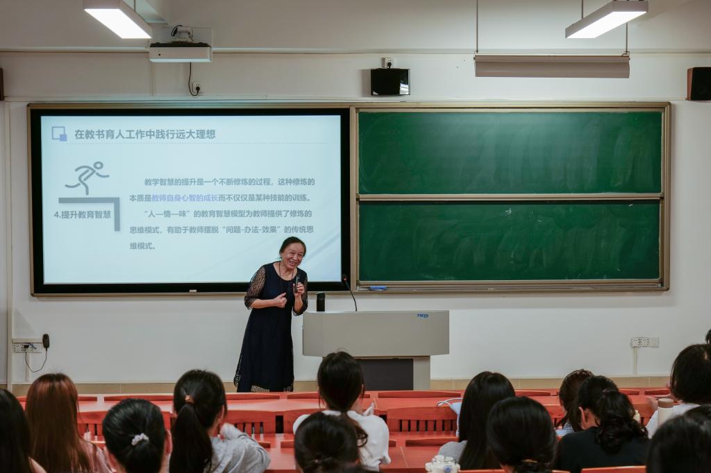 “我做了一辈子教师,但一辈子还在学做教师!”人民教育家于漪用博大的胸襟和朴实的教诲创造了一个又一个育人“奇迹”,培养了一个个大写的“人”。陶教授深情讲述人民教育家于漪丰富的教育实践和深刻的教育思想,并结合粤东西北乡镇小学发展现状与实际需求,使同学们明白,拥有教育理想的教师会更加积极主动、满怀激情地投入教育事业。新时代教师就是要将教育理想融入工作,融入区域发展,要有积极的心态、明确的目标、渊博的学识,要把握成长规律,坚持终身学习,积极投身实践,提升教育智慧,真正尊重员工、关爱员工、帮助员工,在有情感、有温度的教育中培养员工逐步形成正确的人生观、世界观、价值观。