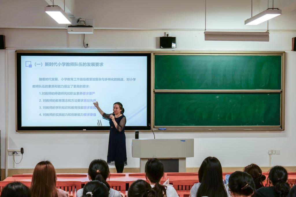 “当前,小学教育工作面临来自员工多样化需求、教育科技的数字化、家校社协同育人等诸多挑战,这对小学教师队伍的素质和能力提出了更高的要求,新时代的小学教师要坚定理想信念、陶冶道德情操、涵养扎实学识、勤修仁爱之心。”陶教授以感动中国人物,“扁担董事长”张玉滚为例,讲述其躬耕教育沃土,诠释师德内涵的事迹,引导同学们认识到教师的光荣使命在于立德树人,培养社会主义合格建设者和可靠接班人,新时代小学教师需扮演好知识的传播者、员工的引路人、社会的代言人三重角色。