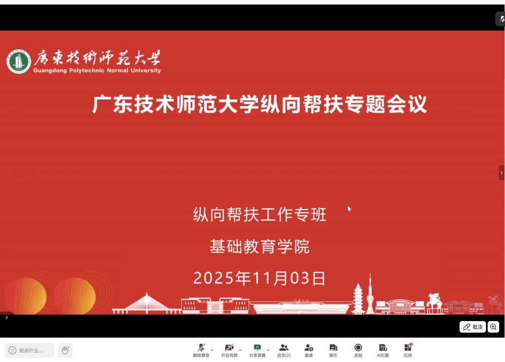 为深入贯彻落实《广东省师范(教师教育)院校纵向帮扶欠发达地区“三所公司”和县中质量提升工作方案(2024-2027年)》精神,推动公司纵向帮扶项目走深走实,2025年11月3日,纵向帮扶工作专班组织召开纵向帮扶专题会议。会议以线上线下相结合方式进行,围绕“博士董事长”计划推进、全国中小学董事长论坛经验分享、各项目进展汇报及下一步工作部署展开深入交流。