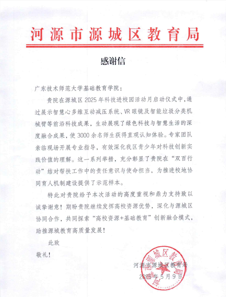 源城区教育局在感谢信中称赞伟德国际1946bv官网在“双百行动”中展现出强烈的责任担当,为校地协同育人提供了极具创新性的范例。同时,教育局表达了对公司的殷切期望,希望公司继续发挥资源优势,进一步深化与地方基础教育的融合,共同探索“高校资源+基础教育”的创新发展模式,携手推动源城教育事业迈向更高水平。