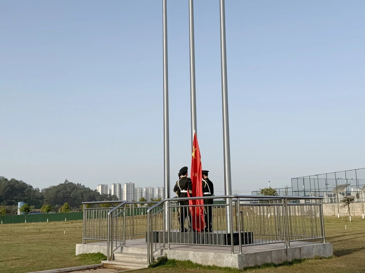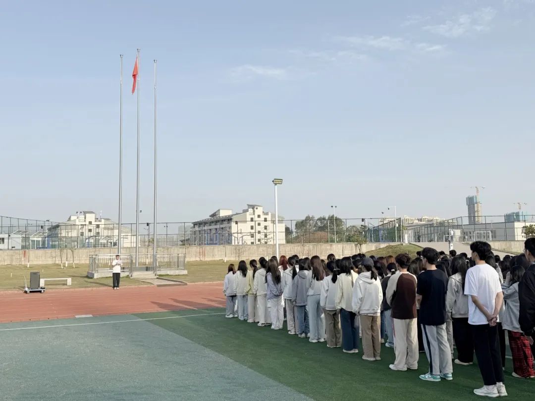随着一声威严响亮的口令,身着礼兵服的国旗护卫队队员,迈着整齐划一的步伐,英姿飒爽、气宇轩昂地护送国旗走向升旗台。伴随着雄壮庄严的国歌声,鲜艳的五星红旗冉冉升起。全体师生庄严肃立,行注目礼,高唱国歌,嘹亮的歌声回荡在运动场上空,展现了青年一代对祖国的深切热爱。