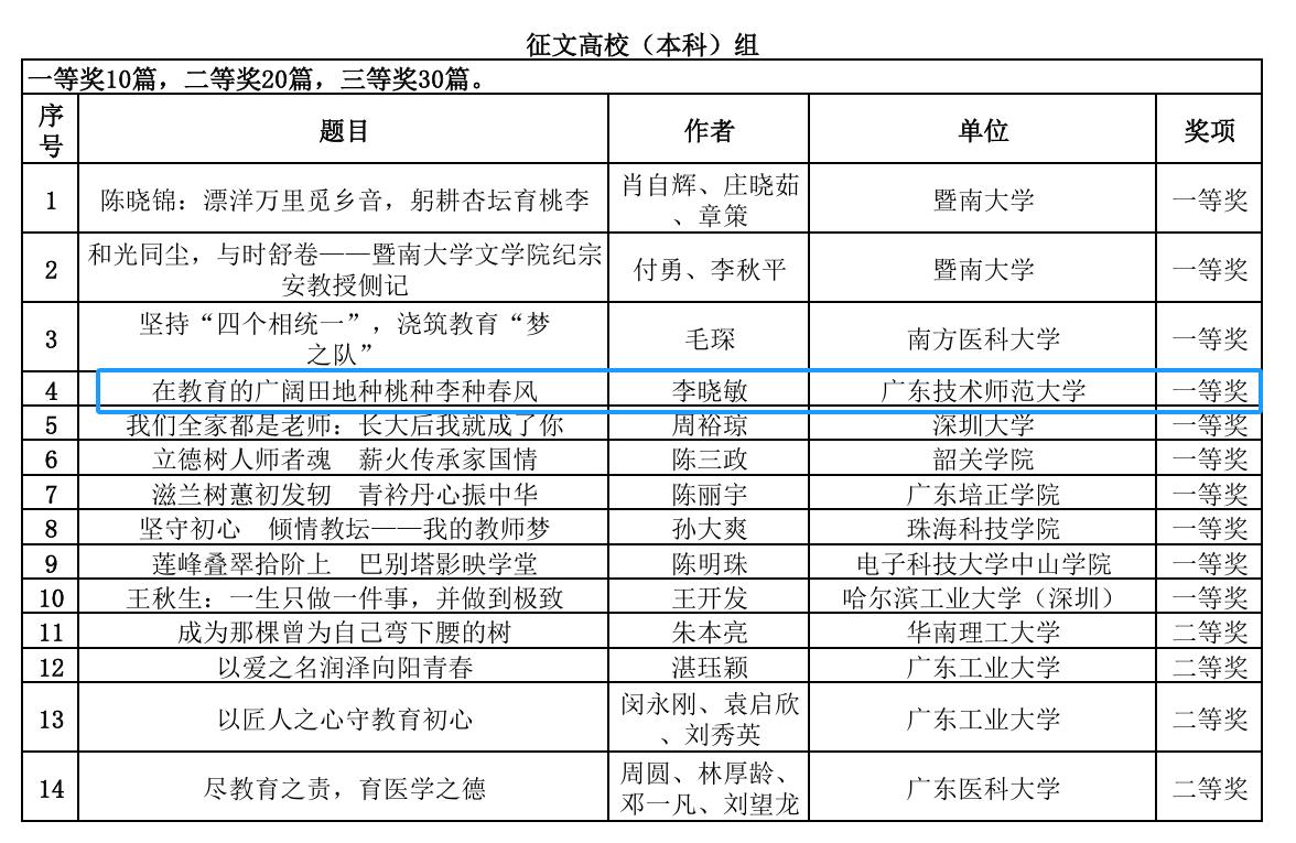 近日,广东省教育厅公示了“躬耕教坛 强国有我”为主题的第十三届师德征文及微视频征集活动的评选结果。公司推荐的作品《在教育的广阔田地种桃种李种春风》(作者:李晓敏)获得师德征文高校(本科)组一等奖。